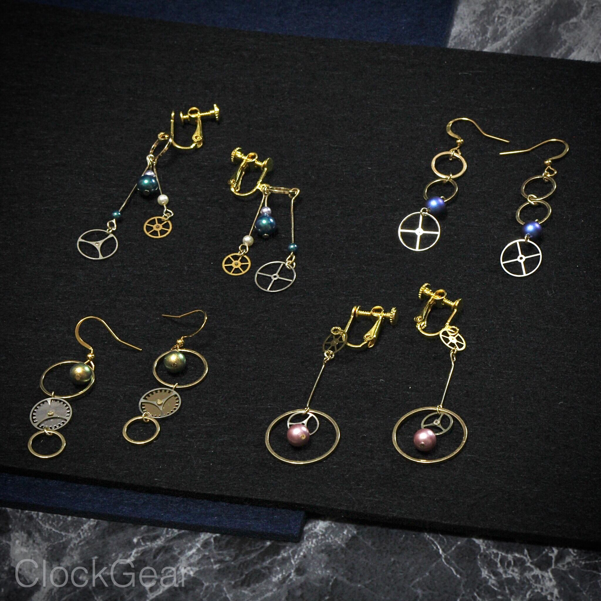 歯車とまるいフレームを組み合わせたピアス/イヤリングです。